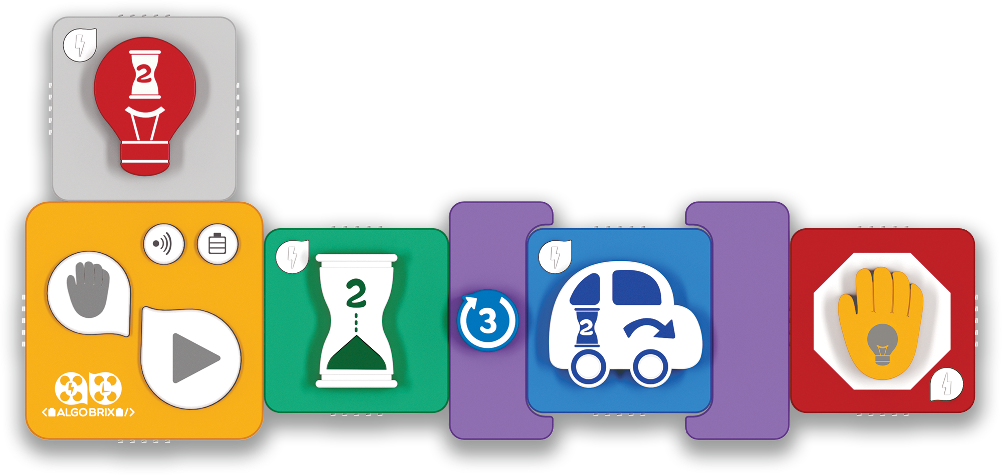 In the AlgoPlay curriculum, utilizing the coding language of Algobrix®, students first assemble a building block model. They then formulate various code sequences using tangible or screen function and parameter blocks. By activating the “play” block, the robot executes the coding sequence. When students combine function and parameter blocks, they instruct the robot with specific commands, like moving forward or activating a red light.